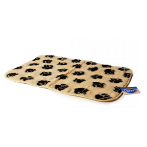 Zachte ligmat/deken met voetjesprint. Afmetingen: 75 x 100 cm. Kleur: beige. Wasbaar.